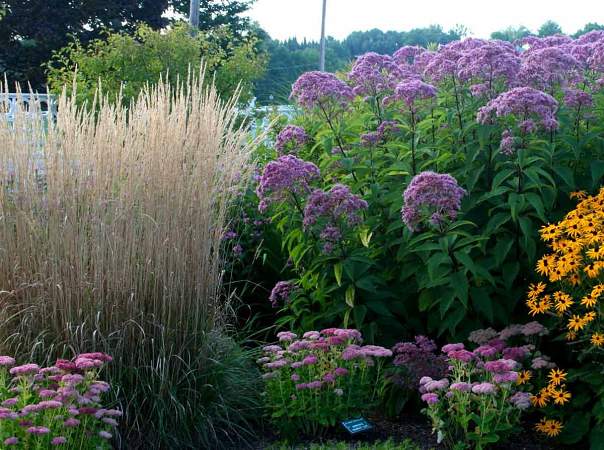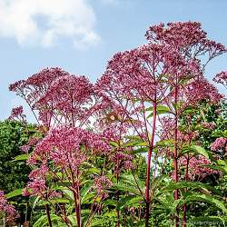 Цветки розовые, собраны по 3-7 в соцветия-корзинки, которые образуют сложные щитковидные соцветия диаметром 20 см, привлекают пчёл и бабочек. Хорошо растёт на влажных почвах.