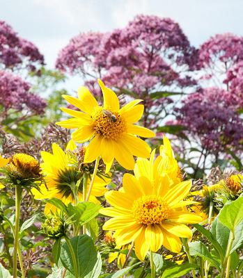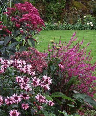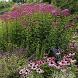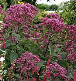Посконник Riesenschirm (Ризенширм). Посконник — настоящее украшение сада, особенно в конце лета, когда на фоне мощных кустов появляются крупные щитковидные соцветия. Именно в это время посконник царствует в саду. У сорта Ризенширм сине-зеленые ланцетные листья на мощных темных стеблях. Крупные сиренево-розовые пушистые соцветия. Он быстро нарастает.