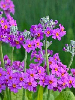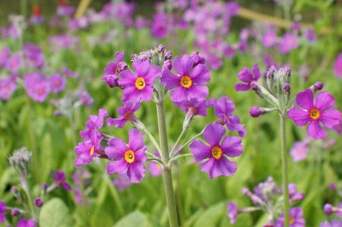 Примула Beesiana (Бисса). Растение с очень крупными овально-ланцетными закругленными на вершине листьями, длина которых достигает 50 см. Розово-сиреневые или карминово-красные цветки до 2 см в диаметре, собранные яркими "кольцами" на высоком цветоносе, появляются в июне.
