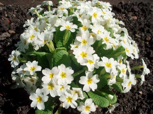 Примула бесстебельная Alba (Альба). Имеет светло-зелёные удлинённые шероховатые листья на коротких черешках, собранные в прикорневую розетку. Цветки довольно крупные, в диаметре достигают 4 см, одиночные или в зонтиковидных соцветиях, белые. Полностью зимостойка, очень быстро разрастается, создавая красивые куртины.
