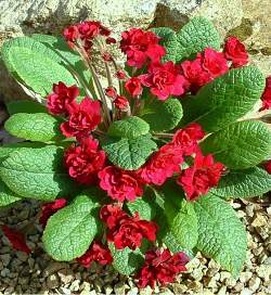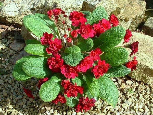 Примула обыкновенная Corporal Baxter (Корпорал Бакстер). Очень красивый сорт. Гибридного происхождения, зимостойка в средней полосе. Высота цветоносов до 25 см. Розетка состоит из кожистых слегка морщинистых листьев. Цветки крупные, махровые, лилово-красные.