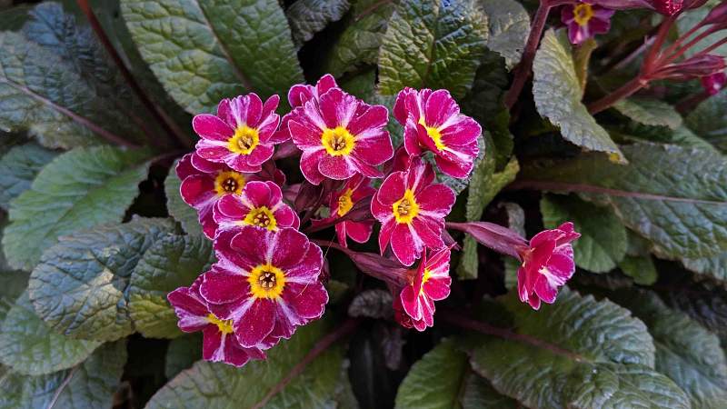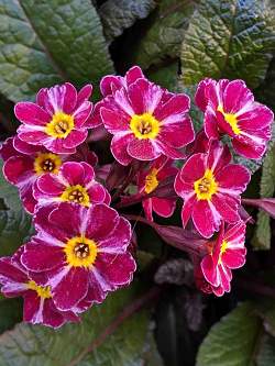 Примула Dark Rosaleen (Дарк Розалин). Цветки тёмно-малиновые, весной с розово-белыми полосками. Листья зелёные с заметными пурпурно-бронзовыми прожилками, на солнечном месте листья более тёмные и яркие. Молодые листья бронзово-красные. Высота 15 см.