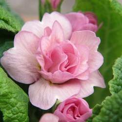 Примула бесстебельная (обыкновенная) Sue Jervis (Сью Джервис). Новый замечательный сорт с махровыми цветками. Окраска розовая, глазок желтый. Листья светло-зеленые, морщинистые.