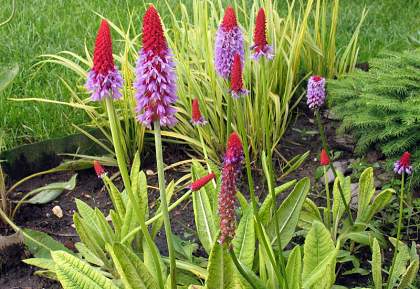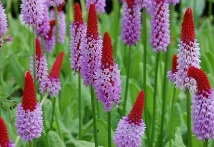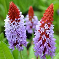 Примула орхидная Red and Rose (Ред энд Роуз). Листья узкие и растут вертикально. Форма соцветия напоминает гиацинт. Цветок имеет красную чашечку, а лепестки миниатюрных цветков бледно-фиолетовые, как у лаванды. Распускание происходит постепенно и довольно долго (4-5 недель), а колос меняет свою окраску. Цветение тем продолжительнее, чем прохладнее погода.