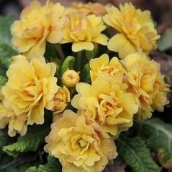 Примула бесстебельная Sunshine Susie (Саншайн Сьюзи). Очаровательный гибридный сорт с довольно крупными желтыми или абрикосово-желтыми цветками. Цветки махровые. Цветение дружное в мае.