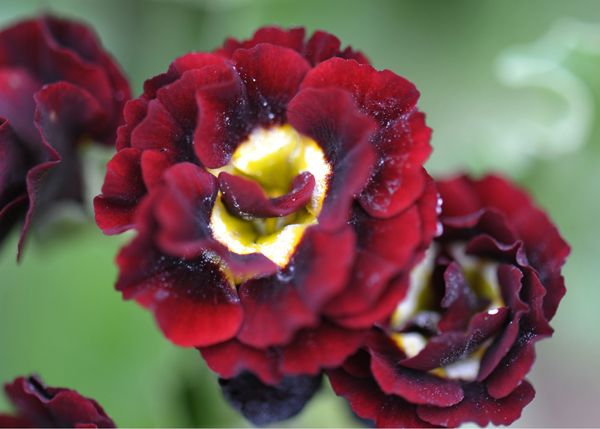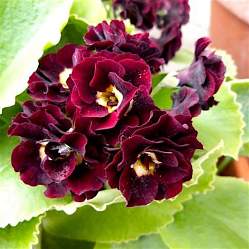 Примула ушковая Black Jack (Блэк Джек). Высота 15-20 см. Цветки темно-вишневые, махровые, на коротком цветоносе, в соцветии из 6-7 шт. Цветет в мае-июне в течение 40 дней.