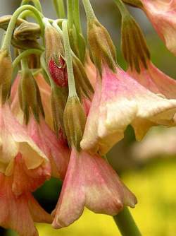 Примула Вальтона. Цветоносы 50 см в высоту поддерживают большое количество душистых, похожих на крохотные абажюрчики цветков персикового цвета. Привлекательная пышная листва состоит из неровно зубчатых, гладких листьев, что делает растение декоративным и по окончании цветения. Зацветает на второй год после посадки, в первый год формирует розетку листьев и закладывает цветочные почки.