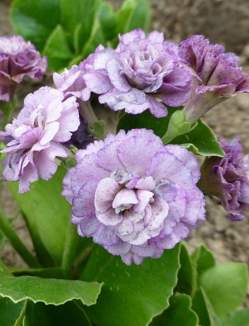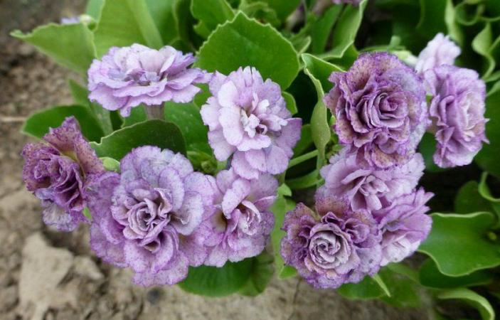 Примула Xaver Light (Ксавьер Лайт). Листья примулы ушковой вечнозеленые, плотные, кожистые, темно-зеленые, ланцетовидные или округлые, слабозубчатые по краю, длиной 7-20 см. Цветки сиреневые с темно-фиолетовыми веснушками, махровые. Цветки по 5-20 штук собраны в соцветия-зонтики на упругих цветоносах высотой 10-25 см. Цветет с апреля по июнь около 40 дней. Двухлетнее растение имеет от 4 до 10 цветоносов.