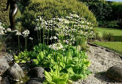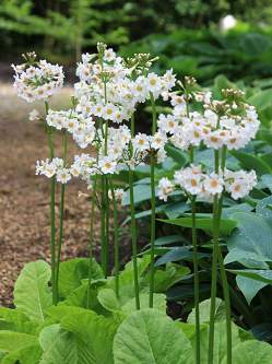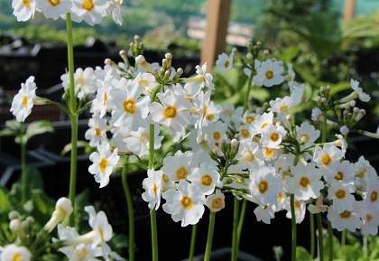 Примула Alba (Альба). Зимостойкая канделябровая примула для полутенистых мест. Растение многолетнее, высотой до 30 см. Цветки белоснежные, с выразительным желтым центром, до 2,5 см в диаметре, собраны по 7-10 штук в зонтиковидные соцветия. Цветет в апреле-мае в течение 40-45 дней. Предпочитает рыхлые, достаточно увлажненные плодородные почвы.