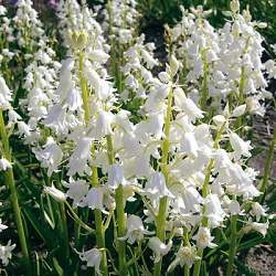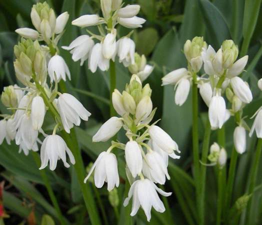 Пролеска колокольчатая White (Вайт). Цветет в июне белыми колокольцами, довольно крупными, собранными на цветоносе как у гиацинта. Высота 25-30 см. Растение обаятельное, эффектное и очень легкое в выращивании. На одном месте растете много лет, не требует выкапывания. Сажать луковицы следует близко друг к другу, чтобы образовался своего рода кустик. Вразбивку смотрится хуже.