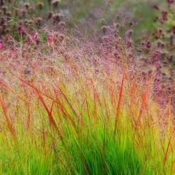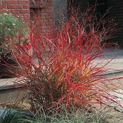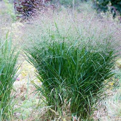 Просо Rehbraun (Ребраун). Декоративная многолетняя трава образующая прямые кусты. Листья тёмно-зеленые, в августе окрашиваются в красноватые тона.