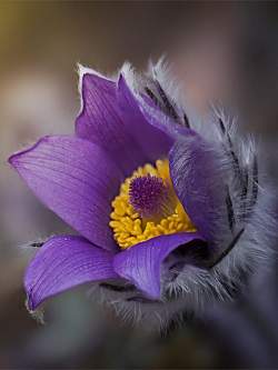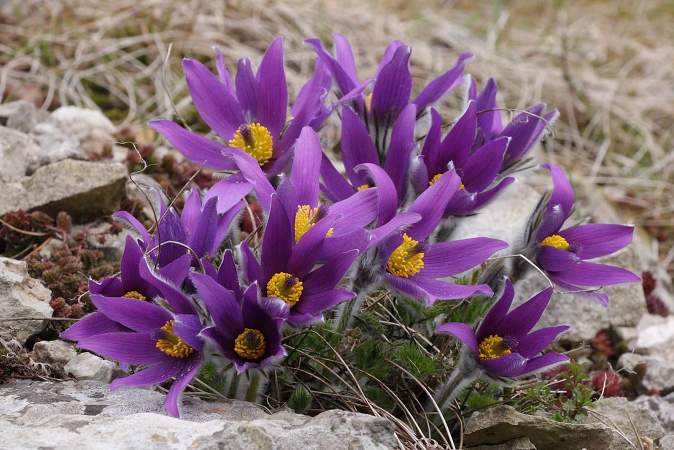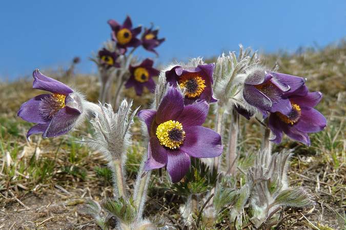 Прострел горный. Отличается от других видов необычной темно-фиолетовой окраской цветов. Цветение начинается весной, когда другие растения еще не проснулись после зимней спячки.