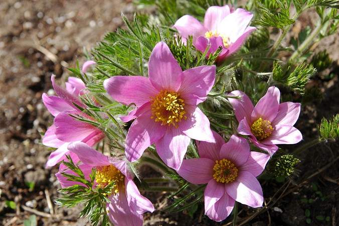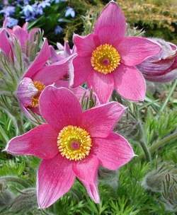 Прострел Pink (Пинк). Цветки очень крупные, колокольчатые, розовые, распускаются до появления листьев. Цветет в апреле. Листья ажурные, опушенные. В гравийных садиках образует большие эффектные кочки. Это растение — звезда весеннего сада!