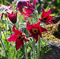 Прострел Red (Рэд). Низкорослый травянистый многолетник. Цветки колокольчатые, крупные, бордовые с винным оттенком, распускаются до появления листьев. Цветет в апреле. Особую декоративность придает растению в пору плодоношения плод-многоорешек с длинными волосистыми столбиками.