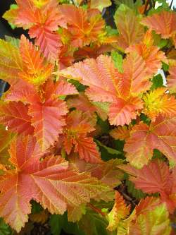Пузыреплодник Amber Jubilee (Эмбер Джубили). Кустарник высотой 180-200 см и шириной 120-150 см. Листья эффектные, на молодом приросте оранжевые с жёлтыми прожилками с весны до лета, осенью - фиолетовые. На старой древесине листья летом зелёные. Цветки белые или кремово-розоватые, в соцветиях, расположенных вдоль побегов. Цветение в конце мая-июне. Плоды ярко-красновато-коричневые. Место солнечное или полутенистое. Сорт устойчив к засухе.