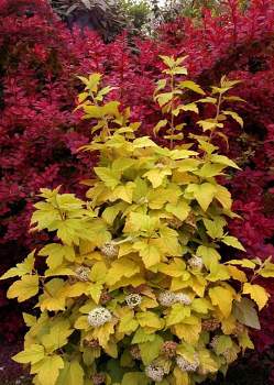 Пузыреплодник Angel Gold (Энжел Голд). Кустарник с плотной, густой, полушаровидной кроной высотой и диаметром до 2 м. Побеги слегка изогнутые, средней прочности, довольно изящные, к середине лета приобретают красивый красно-коралловый цвет.