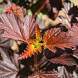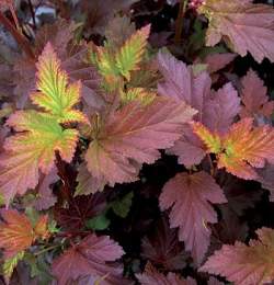 Пузыреплодник Center Glow (Сентер Глоу). Высота и ширина куста 2,5 м. Крона имеет овальную форму, с вертикальными побегами коричневого цвета. Молодые побеги пурпурные. Форма листа характерная для вида. Листья темно-красные с изменяющейся окраской. Взрослые однотонные, красные, молодые красные с золотой серединой, часто красный оттенок сохраняется в качестве каймы.