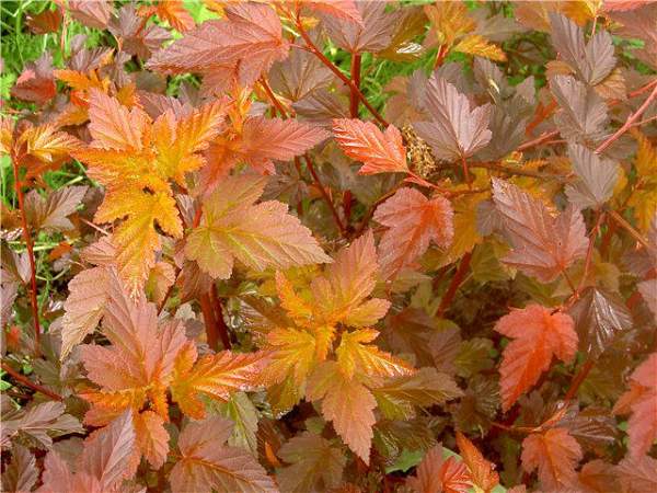 Пузыреплодник калинолистный Diable d'Or, 'Mindia' (Диабле д'Ор, Миндиа). Гибрид 'Dart's Gold' и 'Diabolo'. Очень красивый компактный сорт с эффектной листвой. Густой компактный кустарник до 1-1,5 м высотой с плотным расположением ветвей. Молодые листья медно-оранжево-красные с возрастом становятся пурпурно-красными.