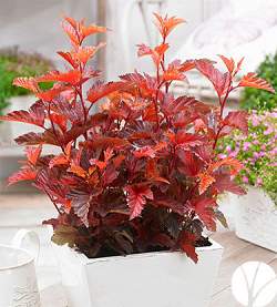 Пузыреплодник Little Angel (Литл Энджел). Карликовый кустарник высотой не более полуметра. Листья красно-пурпурные, мелкие, изящные. Цветки кремово-белые, собраны в плотные щитковидные соцветия.