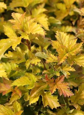 Пузыреплодник Little Leena (Литл Лина). Сорт очень яркий и компактный (высота около 100-120 см). Листья плавно меняет цвет со светло-зеленого на темно-красный. Молодые побеги желто-зелено-оранжевые. Хорош для бордюров, рабаток, смешанных посадок, а также в одиночной посадке.