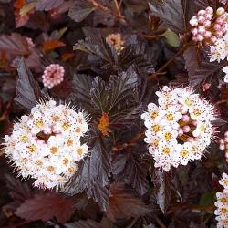 Пузыреплодник Midnight (Миднайт). Самый темный из пузыреплодников, листья очень темно-пурпурные, сохраняют окраску в течение всего сезона. Соцветия розовато-белые, великолепно смотрятся на фоне темной листвы. Высота около 150-180 см, форма раскидистая, на солнце более компактная.