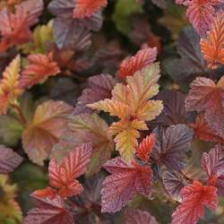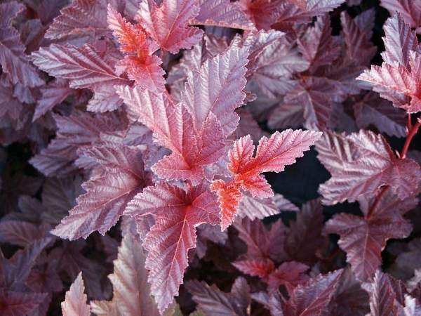 Пузыреплодник Schuch (Шух). Красочный сорт. Молодые листья оранжевые или ярко-красные, позже темнеют до бордовых. На их фоне потрясающе смотрятся бело-розовые соцветия. Позже куст украшают ярко-красные семенные коробочки. Цветение в июне. Высота около 150 см.