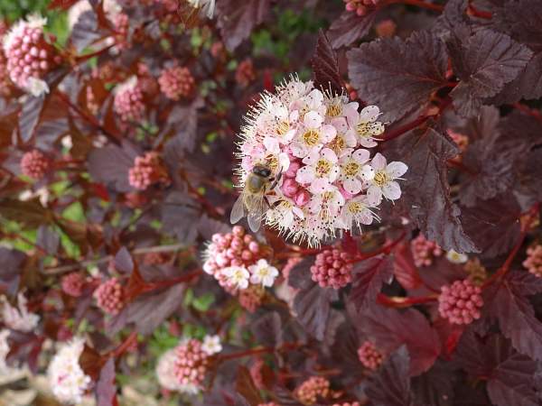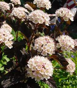 Пузыреплодник Summer Wine (Саммер Вайн). Красивый кустарник с поникающими побегами. Форма фонтанообразная. Листья вначале пурпурные, затем темно-зеленые. Цветение в июне. Цветки собраны в щитки, окраска цветков нежно-розовая.