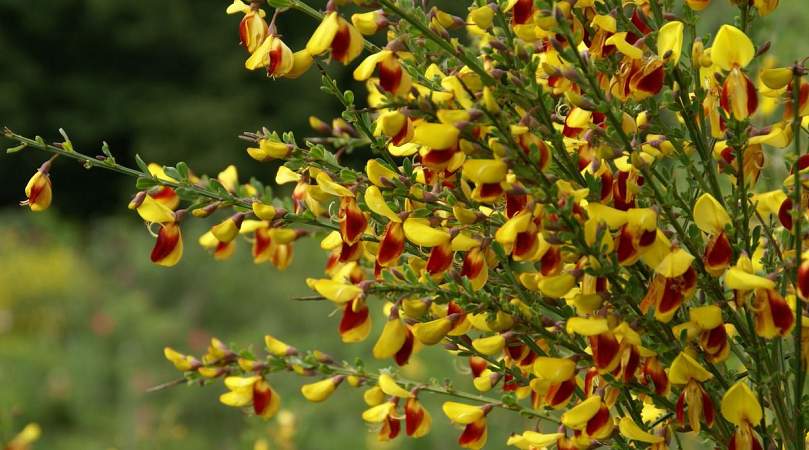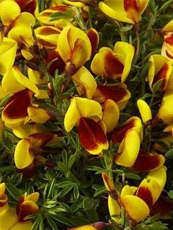 Ракитник Andreanus (Андреанус). Отличается ярко-алыми снизу и желтыми сверху цветками. Высота куста без формирования до 2,5м. Этот вид имеет более крупные листочки и собранные в плотные соцветия цветки с запахом ананаса. Он пленяет обилием ярких цветков-мотыльков до 3 см длиной, сплошь покрывающих ветви этого кустарника.