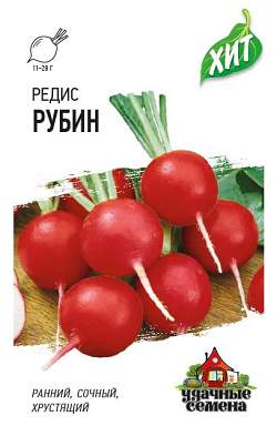 Редис Рубин. Раннеспелый (26-28 дней от всходов до технической спелости) сорт. Розетка полураскидистая. Корнеплод красно-малиновый, округлый, диаметром 3,2-4,5 см, с гладкой поверхностью. Почти полностью погружен в почву. Мякоть белая или бело-розовая, плотная, сочная, сладкая, слабо острого вкуса. Масса корнеплода 11-28 г. Ценность сорта: дружная отдача урожая, отличные вкусовые качества. Рекомендуется для выращивания в открытом и защищенном грунте. Урожайность 1,2-2,3 кг/м2. Выращивают прямым посевом в открытый грунт на глубину 1-2 см.