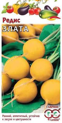Редис Злата 3,0 г. Раннеспелый (19-21 день от всходов до технической спелости) сорт. Посев в грунт производится в конце апреля — начале мая на глубину 1 см. Розетка листьев прямостоячая. Корнеплод округлый, с тупым основанием, желтый, слегка шероховатый, головка маленькая, плоская, зеленоватая, мякоть белая, нежная, сочная.