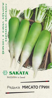 Редька Мисато Грин (китайская дайкон). Раннеспелый (35-42 дня от всходов до уборки корнеплодов) урожайный сорт дайкона летнего посева. Корнеплод цилиндрической формы, длиной 12-14 см, диаметром 4 см, идеально гладкий, массой 250-300 г. Мякоть хрустящая, сочная, с умеренной остротой без горечи. Окраска коры и мякоти корнеплода переходит от нежно-зеленой (от головки корнеплода) к снежно-белой (у его кончика). Рекомендуется для употребления в свежем виде и непродолжительного хранения. Урожайность до 10 кг/м2. Семена высевают в открытый грунт во второй половине июля по схеме 8-10 х 20 см на глубину 2 см.