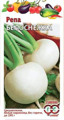 Репа Белоснежка. Среднеспелый (70-72 дней от всходов до технической спелости) сорт. Розетка листьев полупрямостоячая. Корнеплод округлый, белый, массой 250-290 г. Мякоть белая, нежная, сочная, с хорошими вкусовыми, качествами без горечи. Рекомендуется для употребления в свежем, жареном, печеном, тушеном или фаршированном виде.