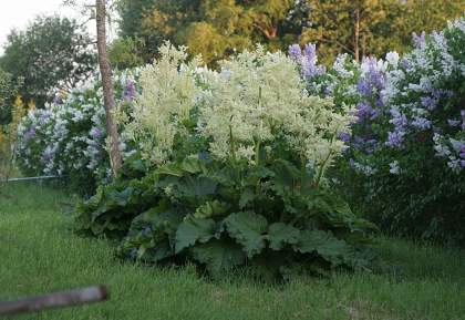 Ревень (Rheum Rhabarbarum). Хорош как в декоративном саду, так и в огороде. Монументальное и чрезвычайно неприхотливое растение, которое в самые короткие сроки способно стать великолепным акцентом. Розетка широких жатых листьев достигает 150 см. Черешки ярко-красные. В цвету возносится на высоту до 120-150 см. Соцветия — очень крупные и пушистые кремово-белые "плюмажи", которые привлекают пчел.