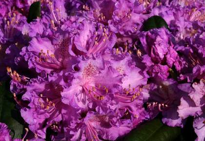 Рододендрон вечнозеленый Alfred (Альфред). Кустарник с довольно широкой кроной. Побеги направлены вверх. Цветки крупные светло-фиолетовые с сильно гофрированными по краю лепестками, с желто-зелеными вкраплениями на верхнем лепестке, собраны в компактные соцветия. Листья кожистые, крупные, продолговато-эллиптические, вечнозеленые.