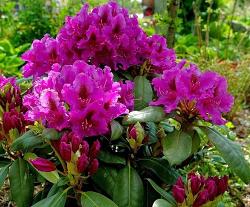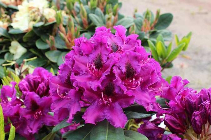 Рододендрон вечнозеленый Azurro (Азурро). Цветки крупные, пурпурные с темно-пурпурным крапом на верхнем лепестке. Собраны в большие округлые соцветия. Цветет продолжительно — до четырех недель в конце мая — начале апреля. Листья темно-зеленые, кожистые, широкие.