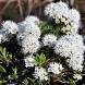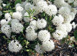 Рододендрон (Багульник) гренландский Helma (Хельма). Вечнозеленый кустарник с продолговатыми листьями (длиной до 2,5 см), белыми цветками (до 1,5 см в диаметре), собранными в зонтиковидное соцветие. Цветет с середины июня до второй декады июля. Рост умеренный. Предпочитает кислые торфяные почвы. Багульник гренландский встречается в северной и западной частях Северной Америки. Растет на торфянистых болотах. Морозостойкость -34 °С.