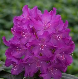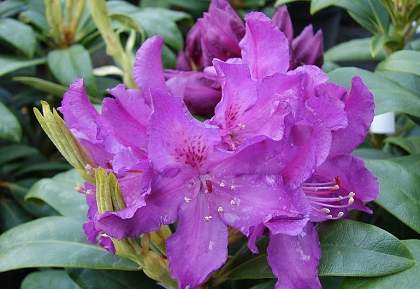Бутоны крупные, слегка опушенные. Цветки пурпурно-фиолетовые. Крап темно-фиолетовый. Цветки собраны в большие соцветия по 10-12 шт. Цветет очень продолжительно, до трех недель. Листья кожистые блестящие. Куст округлый, высотой до 180 см. Диаметр куста до 120 см.