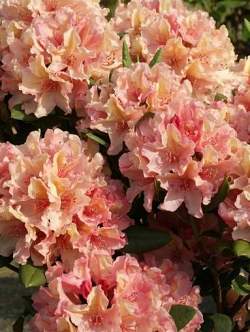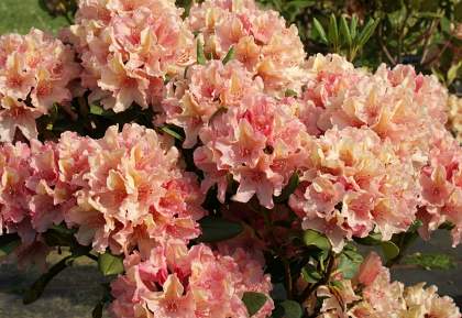 Рододендрон Brasilia (Бразилиа). Сильнорослый кустарник. Листья большие и блестящие. Цветы абрикосово-оранжевые с нежным лимонным пятном. Темно-зеленая листва очень блестящая.