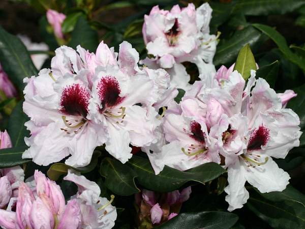 Рододендрон вечнозелёный гибридный Calsap (Калсап). Крупноцветковый. Эффектные белые цветки с большим бордовым пятном. Листья крупные. Отличная энергия роста, куст широкий и свободный, хорошо разрастается. Высота куста в 10-ти летнем возрасте 1-1,2 м. Морозостойкость –30°C. Цветение с конца мая. Используется для групп, композиций с хвойными, одиночной посадки.