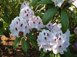 Рододендрон вечнозелёный гибридный Calsap (Калсап). Крупноцветковый. Эффектные белые цветки с большим бордовым пятном. Листья крупные. Отличная энергия роста, куст широкий и свободный, хорошо разрастается. Высота куста в 10-ти летнем возрасте 1-1,2 м. Морозостойкость –30°C. Цветение с конца мая. Используется для групп, композиций с хвойными, одиночной посадки.