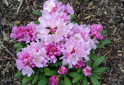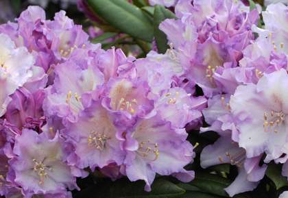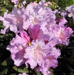 Рододендрон вечнозеленый Caroline Allbrook (Кэролайн Олбрук). Цветки крупные, вначале сиреневые, затем неравномерно светлеют до бледно-розовых и почти белых, что создает эффект перламутра. Крап на верхних лепестках золотисто-коричневатый, слабый. Лепестки гофрированные.