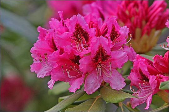 Рододендрон Chevalier Felix De Sauvage (Шевалье Феликс Де Саваж). Получен от скрещивания рододендрона кавказского и неизвестного морозостойкого гибрида. Вечнозелёный кустарник высотой 150-175 см. Цветки малиново-розовые с вишневым пятном, собраны в соцветия по 9-15 цветков. Цветение раннее и продолжительное: с апреля по конец мая.
