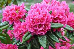 Рододендрон Dr H.C. Dresselhuys (Доктор Дрессельхус). Цветки воронковидные, крупные (6 см), темно-розовые с оливково-зелеными отметинами. Соцветия конической формы, очень крупные. Состоят из 14-21 цветка.