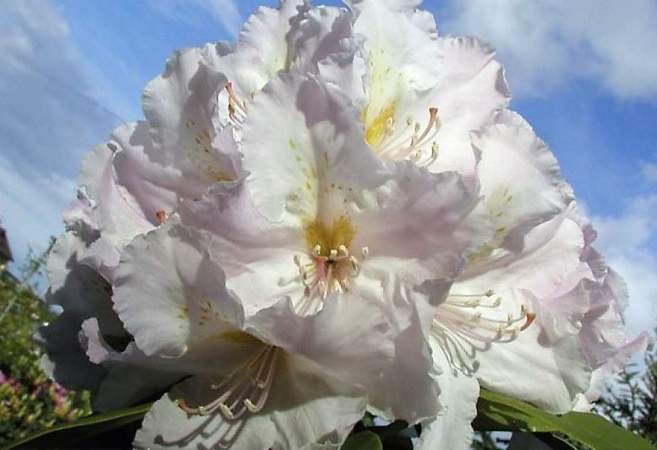 Рододендрон Eskimo (Эскимо) — сорт финской селекции. Вечнозелёный кустарник с шарообразным силуэтом. Листья большие, кожистые, светло-зелёные с заметным жилкованием. Растёт быстро. Ежегодный прирост 8-12 см. Терпеливо относится к освещенным местностям, но лучше высаживать все-таки в полутени, вдали от полуденного солнца, чтобы листья не выгорали.