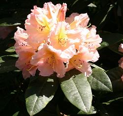 Рододендрон Gloria (Глория) — вечнозелёный кустарник с шарообразным силуэтом. Цветки красивого кремово-персикового цвета с желтой подсветкой у основания. Высота взрослого растения 110 см. Морозостоек и устойчив. Хорошо растет в разреженной тени.