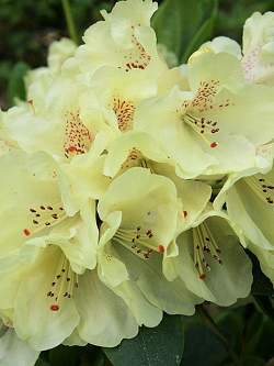 Рододендрон Goldkrone (Голдкроне). Прекрасный, обильно цветущий желтоцветковый сорт. Цветки колокольчатые с красным крапом на верхних лепестках и темными пыльниками, выразительно контрастирующими с окраской венчика. Листья яйцевидные, темно-зеленые, глянцевые.
