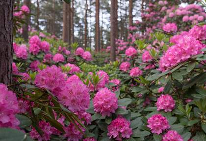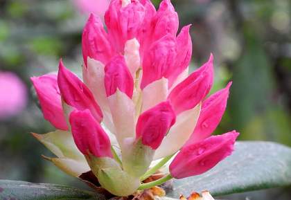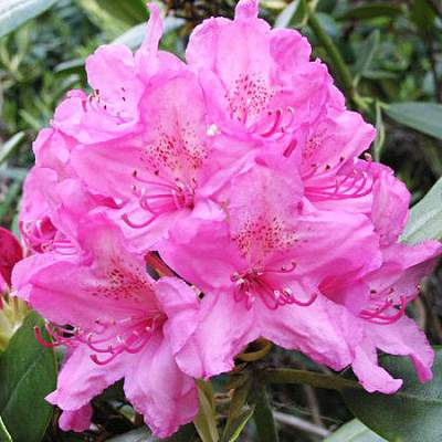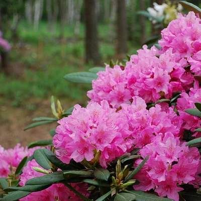 Рододендрон вечнозелёный гибридный Haaga (Гаага) сорт финской селекции. Цветки тёмно-розовые с фиолетовым оттенком. Листья крупные.