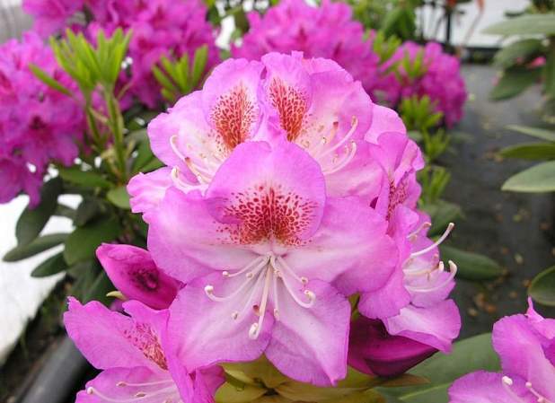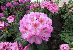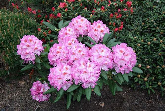 Рододендрон вечнозеленый Kazimierz Odnowiciel (Казимеж Одновичел). По силе роста равен знаменитому катевбинскому рододендрону Грандифлорум. Из всех новинок рододендронов этот считается самым быстрорастущим. Относится к сортам с высокой морозостойкостью (-30 °C).