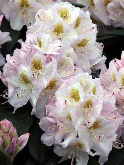 Рододендрон Madame Carvalho (Мадам Карвальо). В мае вас ждет потрясающее зрелище: зеленый куст словно в волнах "купается" в кластерах белых цветов с легким ароматам! Цветки широко-чашевидные с округлыми лепестками, вначале розовые, затем белые с оливково-зеленой отметиной на верхнем лепестке. Растет даже в затененных уголках сада. Морозостойкость высокая.