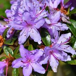 Рододендрон плотный Moerheim (Моерхайм). Кустарник с овальными глянцевыми темно-зелеными листьями. Цветки очень красивые — широко раскрытые, светло-сиреневые с пурпурным рыльцем, собраны в соцветия. Цветет в мае, обильно. Высота до 40 см.